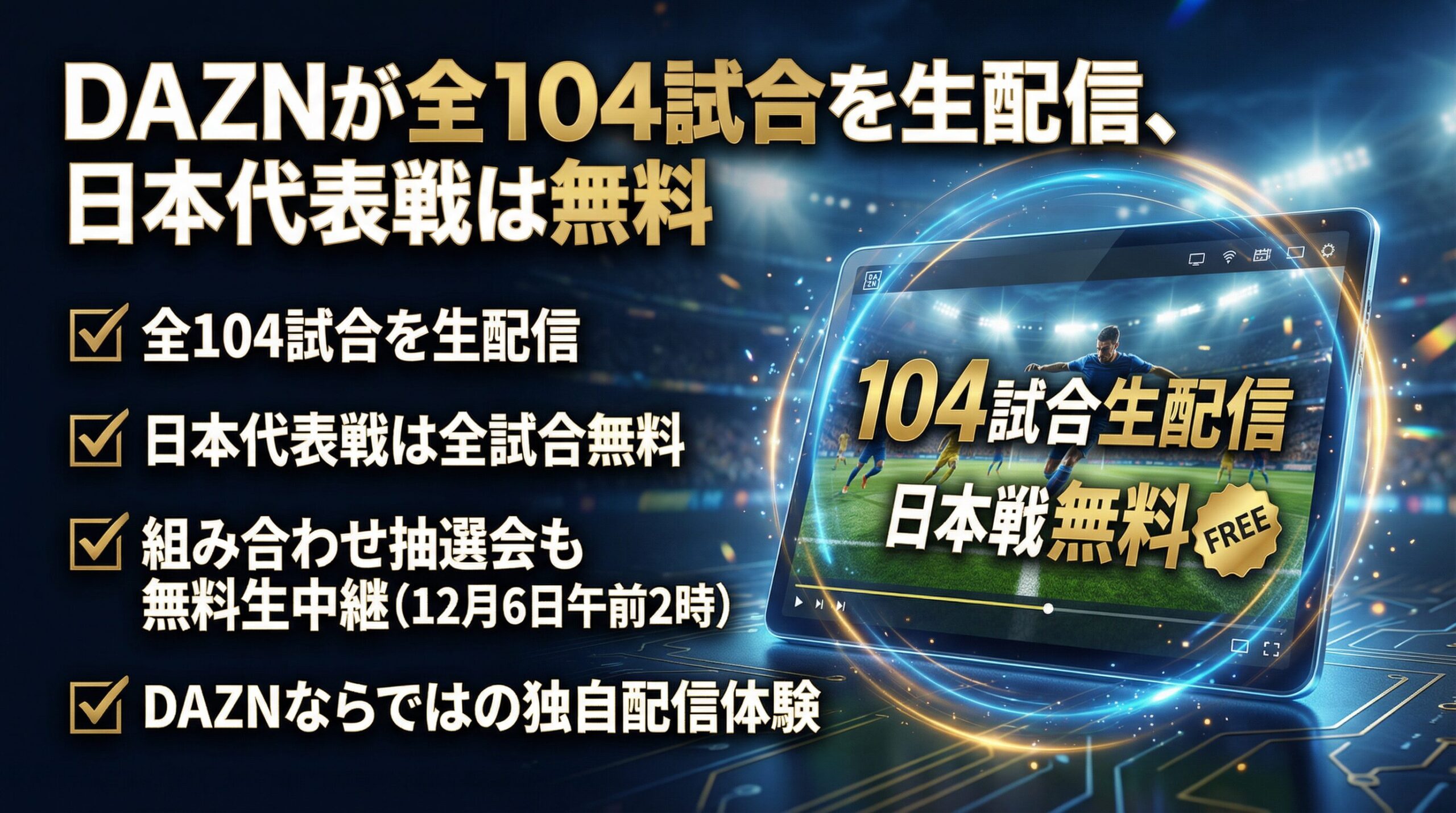 DAZNは本大会の全104試合を配信する方針を公表。抽選会の無料ライブ配信など無料コンテンツを混ぜるケースもありますが、本大会の観戦は有料契約が基本と捉えてください。
