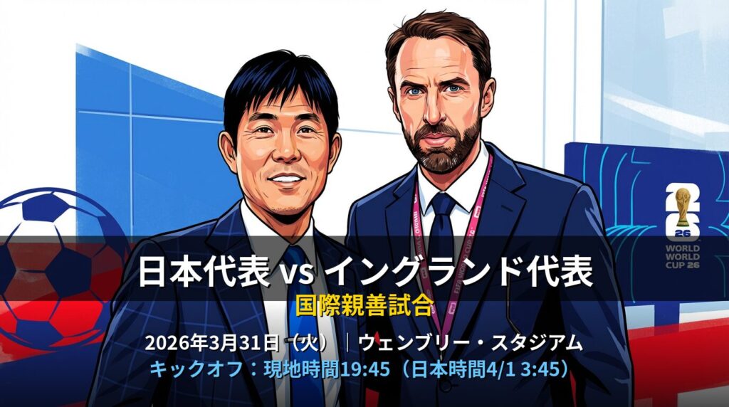 サッカーの聖地で、再び相まみえる両雄 2026年3月31日、サッカーの聖地ウェンブリー・スタジアムで、日本代表とイングランド代表の国際親善試合が開催されることが決定した。FIFAランキング4位の強豪イングランド代表との対戦は、日本代表にとってワールド... -
